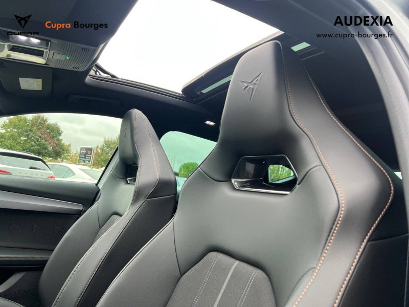 Sièges baquets bimatière textile et similicuir Noir Asphalte avec surpiqûres Copper et logos CUPRA embossés sur les appuie-têtes Contre-portes et dessus de planche de bord en similicuir noir surpiqué